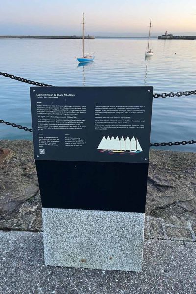 DLR CoCo have installed a new plaque on the Dun Laoghaire Harbour East Pier near the band stand opposite where our 21s are moored during the sailing season. The Irish and English text provides a brief summary of the class history and revival project. The Sailors website QR code is included. Much thanks to Fionan who worked with DLRCC Heritage Officer on the text in both languages.