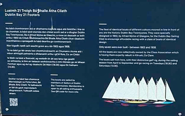 DLR CoCo have installed a new plaque on the Dun Laoghaire Harbour East Pier near the band stand opposite where our 21s are moored during the sailing season. The Irish and English text provides a brief summary of the class history and revival project. The Sailors website QR code is included. Much thanks to Fionan who worked with DLRCC Heritage Officer on the text in both languages.